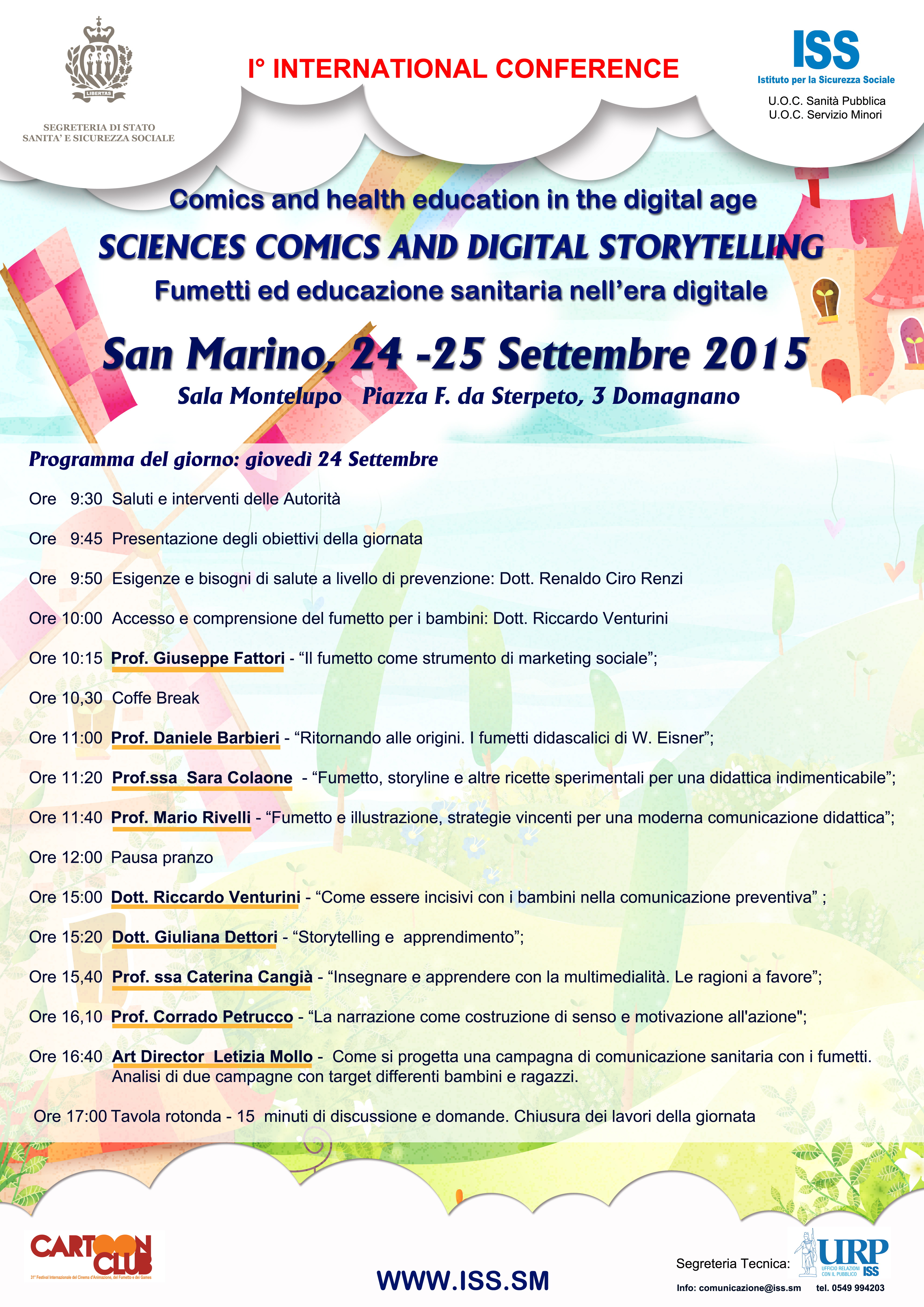 La U.O.C. Sanità Pubblica e la U.O.C. Servizi Minori dell’Istituto per la Sicurezza Sociale di San Marino, con il patrocinio della Segreteria di Stato alla Sanità e Sicurezza Sociale, organizzano una Conferenza Internazionale nelle giornate di giovedì 24 e venerdì 25 settembre 2015 , resso la Sala Montelupo delle Giunta di Castello di Domagnano (Piazza Filippo da Sterpeto, 3 Domagnano RSM) dal titolo:Comics and health education in the digital age sciences comics and digital storytelling ovvero Fumetti ed educazione nell’era digitale