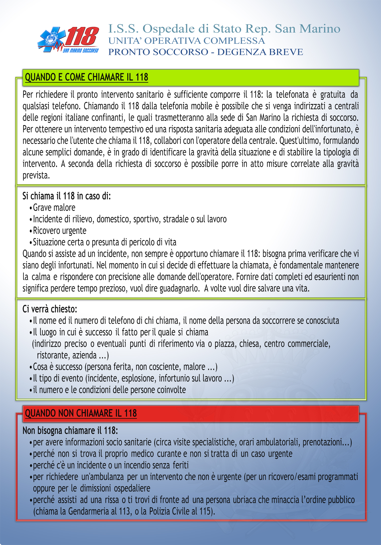Per orientarsi al meglio e capire quando e come chiamare il 118, il Pronto Soccorso del nostro Ospedale di Stato ha elaborato e diffuso da tempo un volantino contenente alcune informazioni utili, scaricabile anche sul sito dellISS.