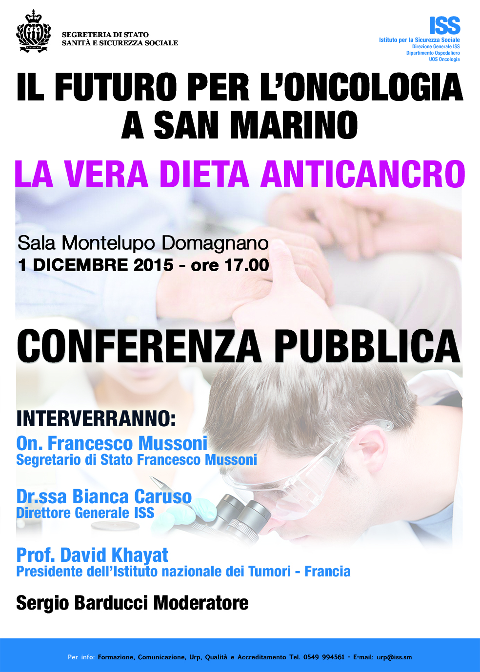 Interverranno: On. Francesco Mussoni - Segretario di Stato; Dr.ssa Bianca Caruso - Dir. Generale ISS; Prof. David Khayat - Presidente dell'Istituto nazionale dei Tumori - Francia