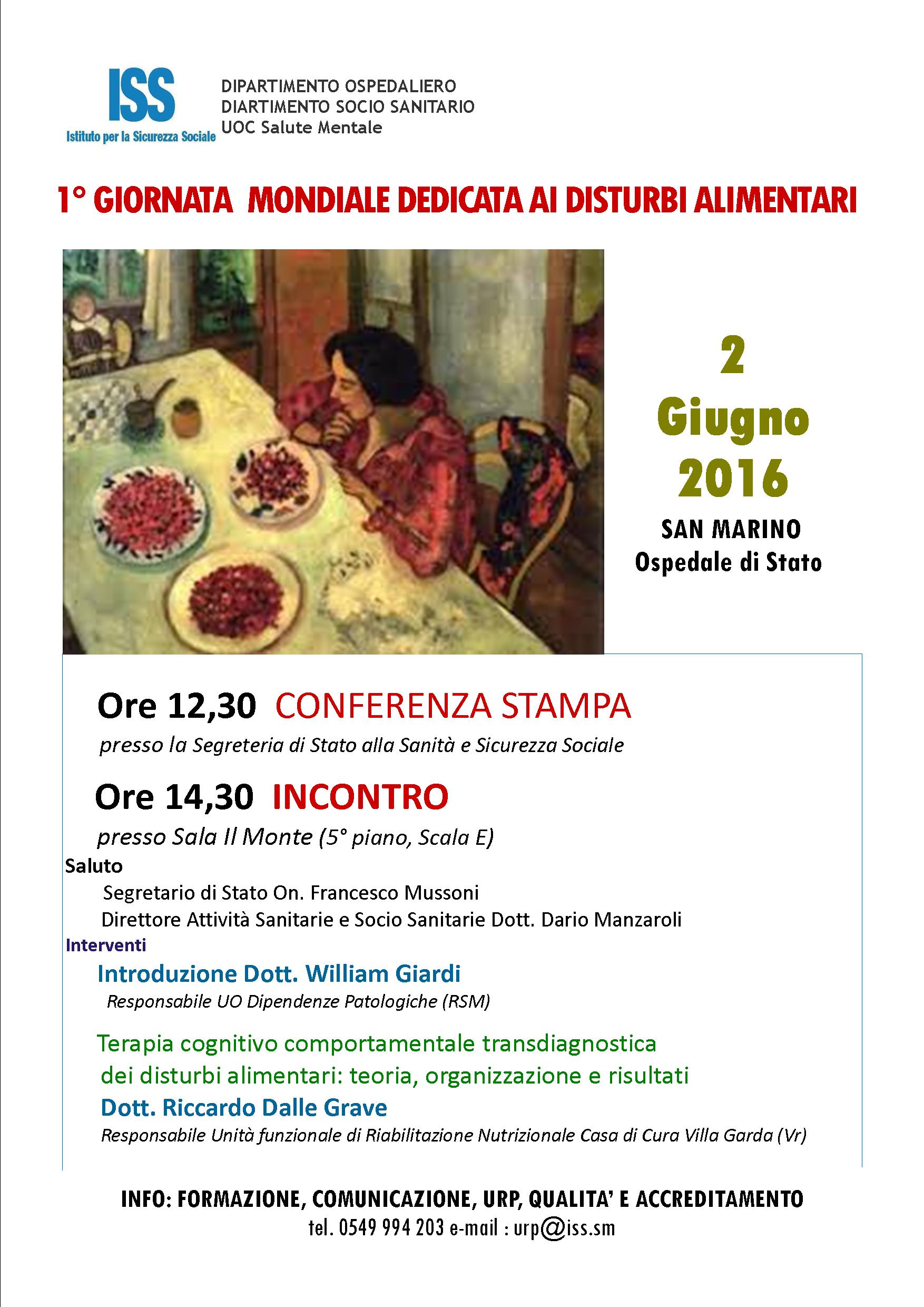 La data del 2 giugno 2016, in cui si celebra la 1a Giornata Mondiale sui Disturbi Alimentari, rappresenta anche per la nostra Repubblica una occasione di riflessione su queste sempre più attuali e più emergenti patologie. Uniniziativa questa per sensibilizzare maggiormente la politica, le istituzioni, i corpi sanitari e la popolazione in generale su disturbi che colpiscono una fascia sempre più giovane della nostra popolazione.