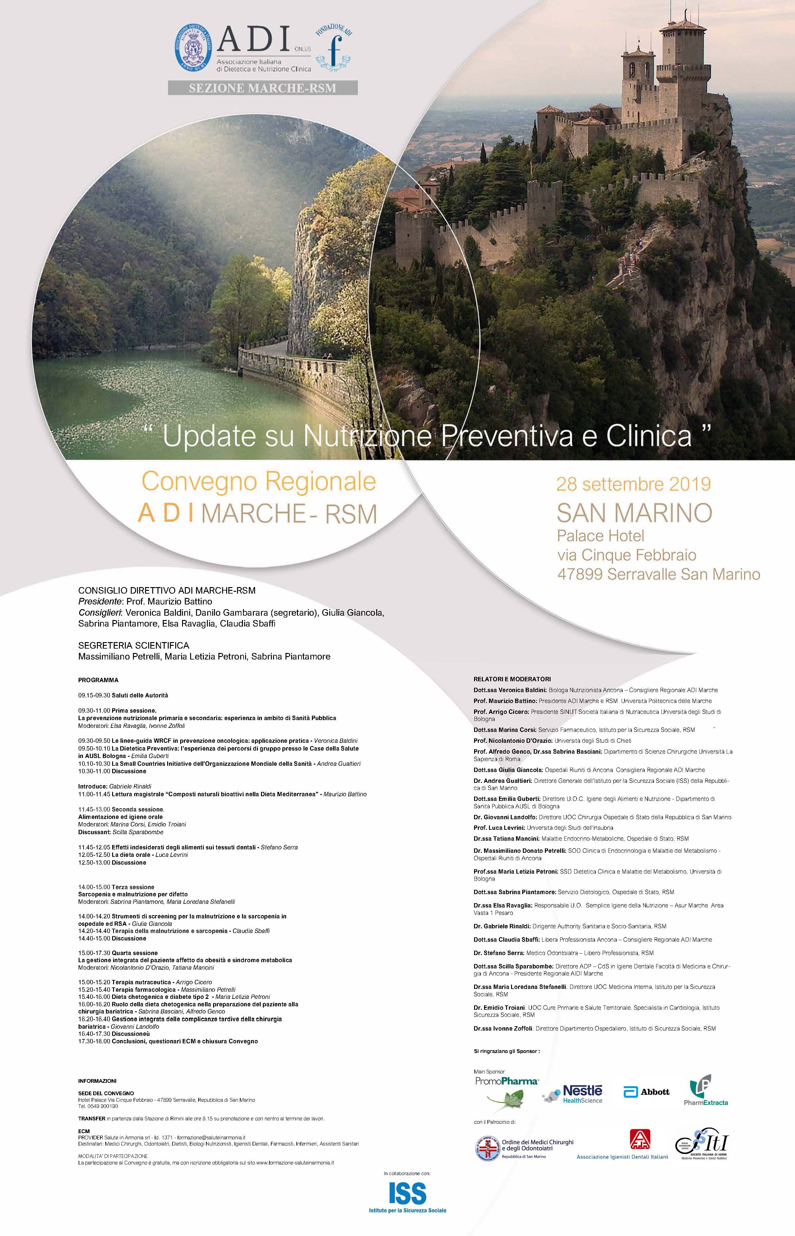 Si terrà sabato 28 settembre il convegno Update in Nutrizione Preventiva e Clinica organizzato dalla sezione Marche-RSM della Associazione Italiana di Dietetica e Nutrizione Clinica (ADI) in collaborazione con il Servizio Dietologico dell'Istituto di Sicurezza Sociale di San Marino. Si tratta di un evento regionale destinato a medici e altri professionisti sanitari che ha già registrato il tutto esaurito.