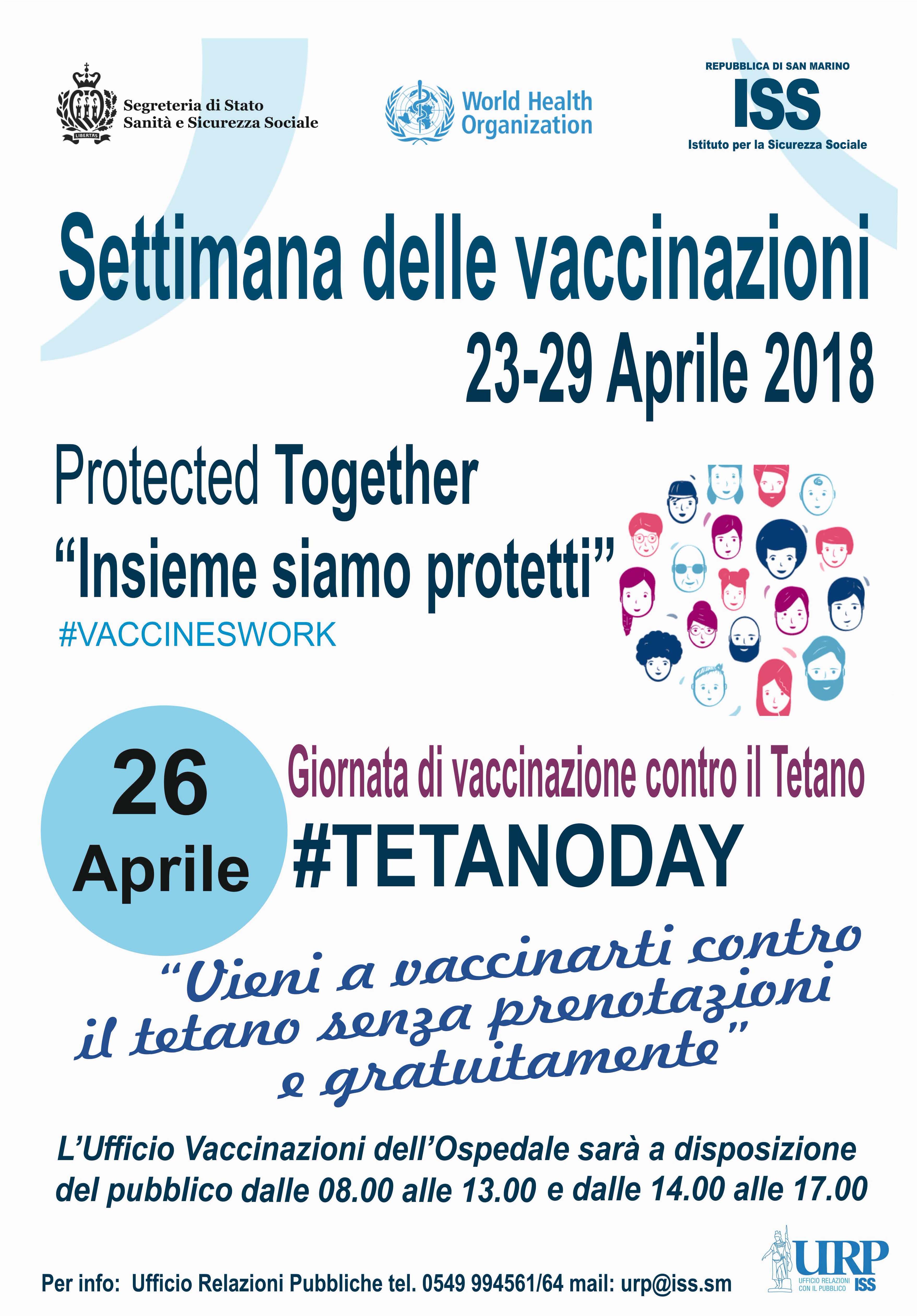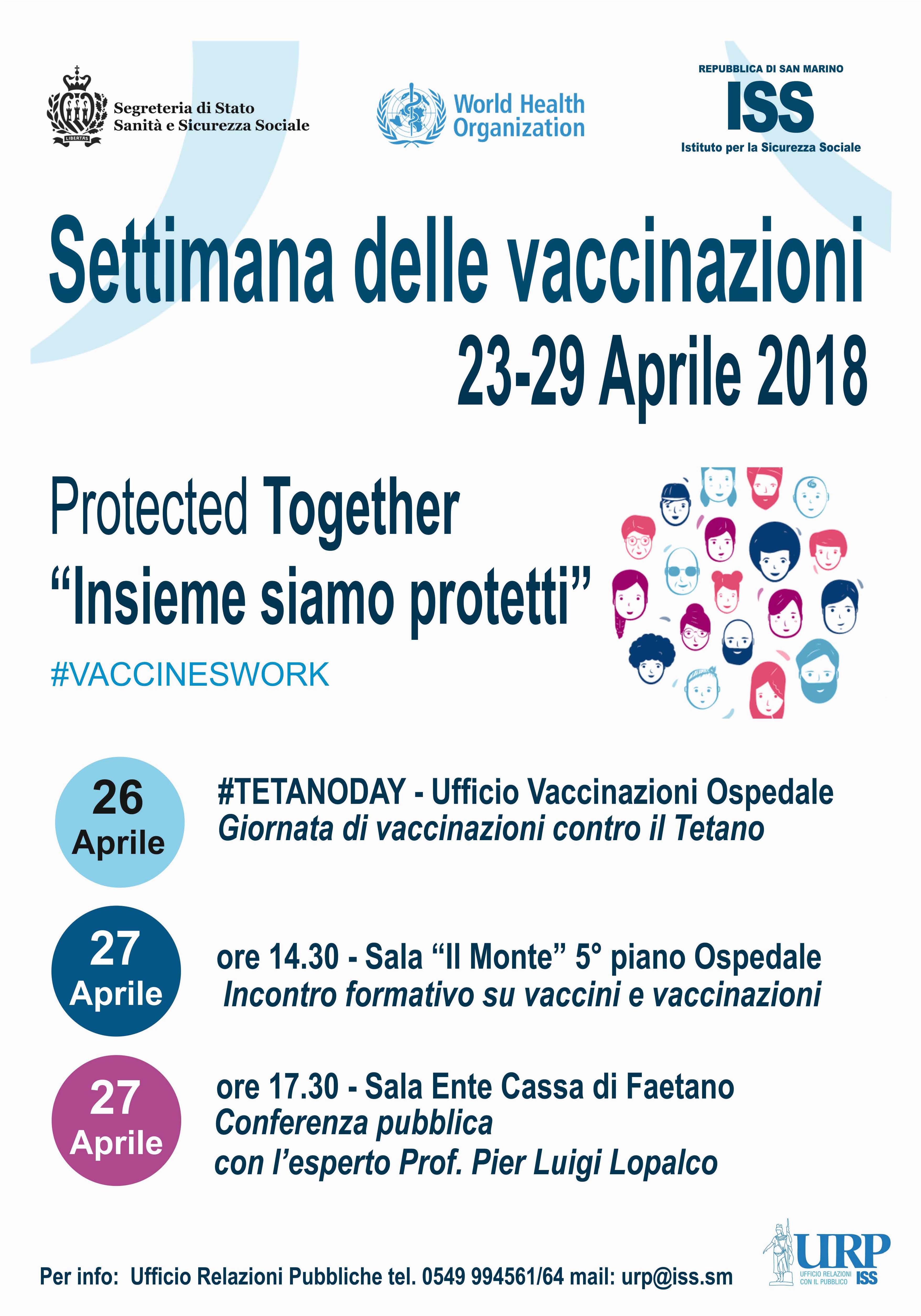 12 Aprile 2018 - La Repubblica di San Marino aderisce da tempo alla settimana sullimmunizzazione, indetta dallOrganizzazione Mondiale della Sanità a cadenza fissa nellultima settimana di aprile, con lo scopo di promuovere la cultura delle vaccinazioni e mantenere tassi di copertura nella popolazione tali da impedire la diffusione di malattie infettive e prevenibili con possibile esito invalidante o fatale.
